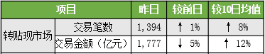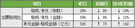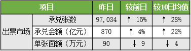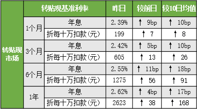 评:出票市场在经历了前日短暂回调后活跃度继续提升,承兑张数和承兑金额较前日分别上涨20个百分点和25个百分点。贴现市场小幅下行,贴现张数和贴现金额较前日分别下跌7个百分点和9个百分点。转贴现市场开始上行,交易笔数和交易金额较前日分别大幅上涨34个百分点和38个百分点。6个月国股转贴现利率2.84%,较前日上涨3个BP,折合每十万扣款1419元,上涨17元。资金市场上,当日有500亿逆回购到期,央行开展800亿逆回购以对冲到期资金影响,Shibor全线波动不大,除隔夜和一周较前日分别上涨4个和2个BP外,其他各期限品种波动均在1个BP以内。
